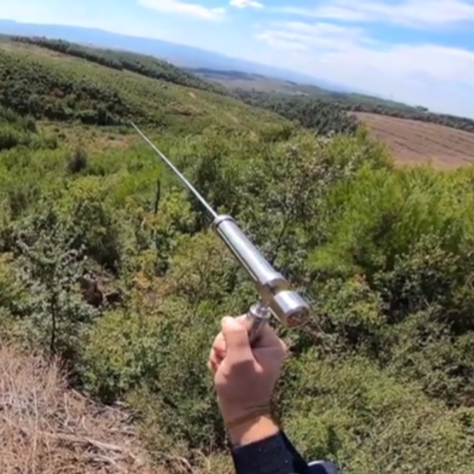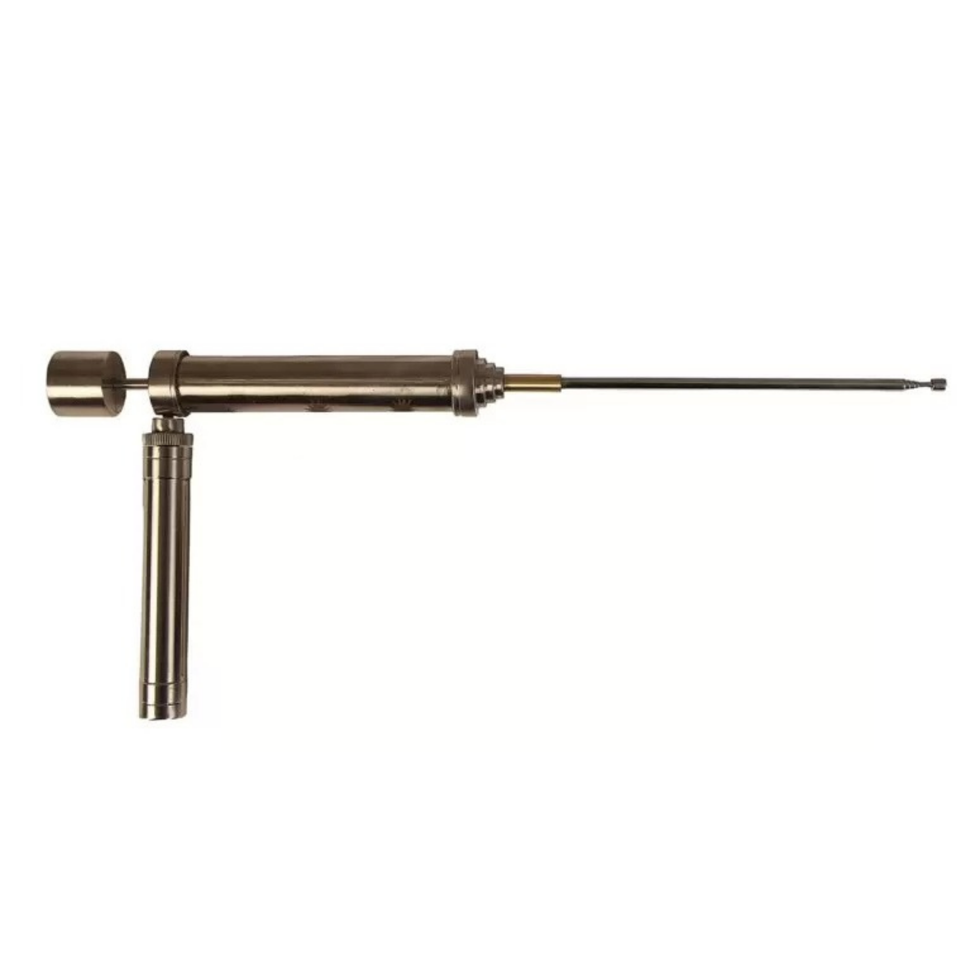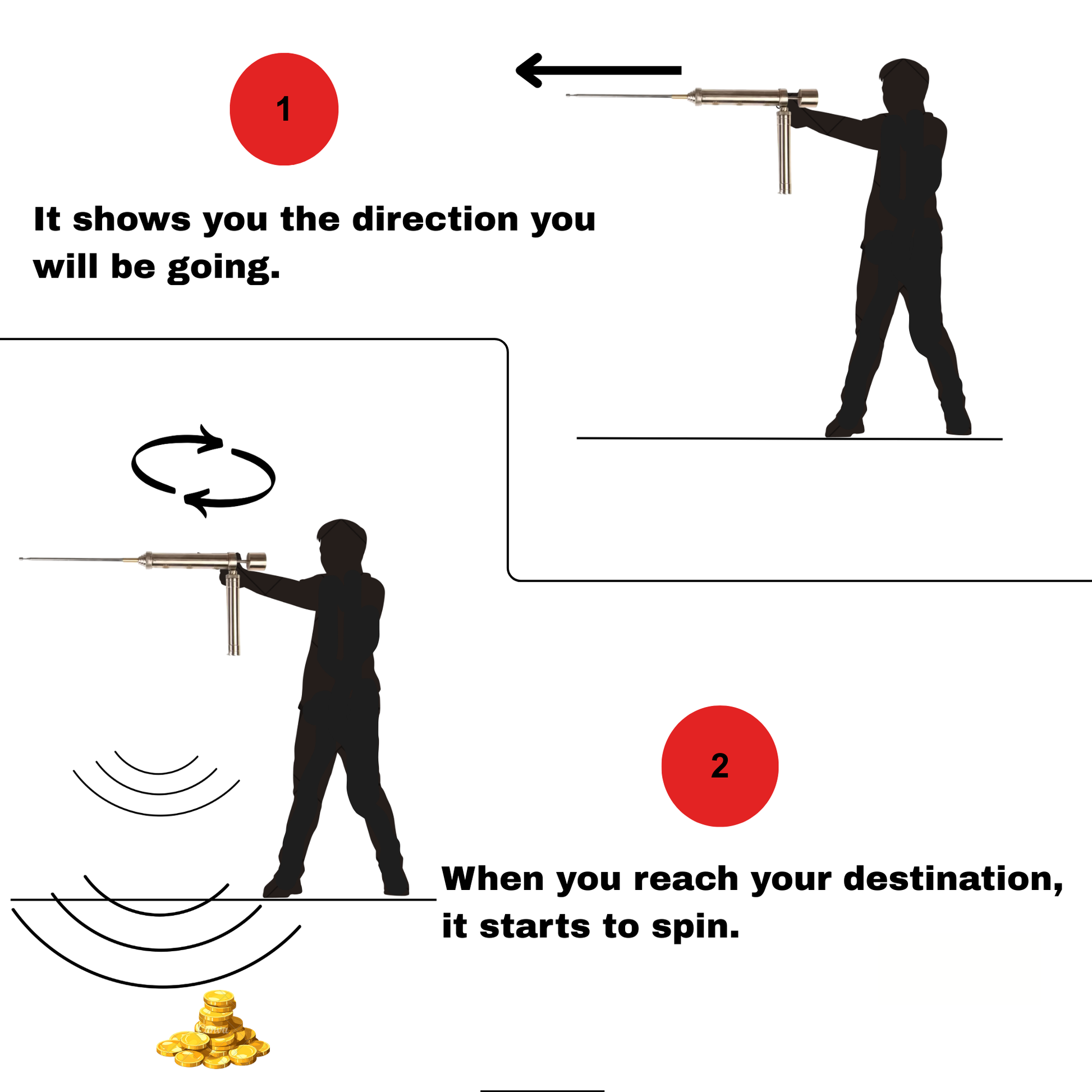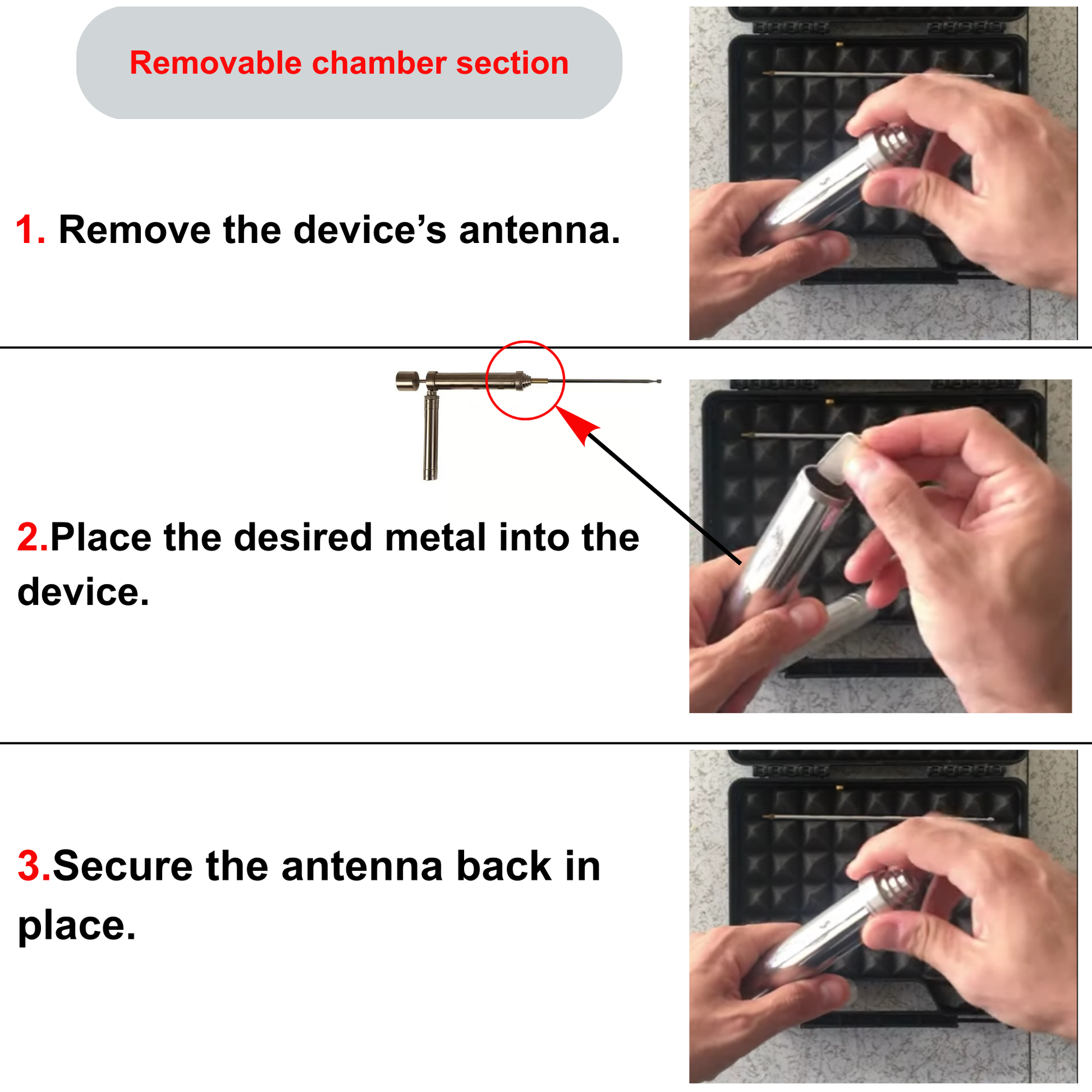 After connecting the device with the telescopic antenna, place the material you want to find into the chamber of the device. For example, if you want to search for gold, place a sample of 22- or 24-karat gold into the chamber and close the lid. First, the device begins scanning the area. Then it aligns itself with the target, and once it detects it, the device starts rotating 360 degrees around its own axis. In this way, the target is located.