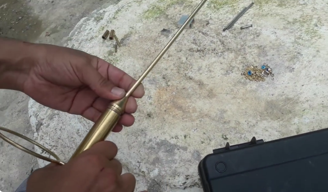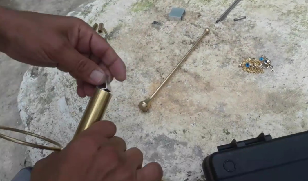 Gold, silver, bronze, lead, copper, diamond, emerald — whatever you want to find, just place a sample inside. Once the sample is placed, the device will direct you toward that material.